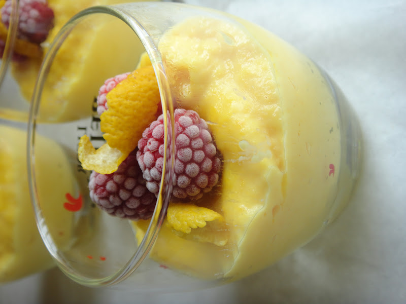 No momento de servir enfeita-se com raspas de limão e as framboesas.