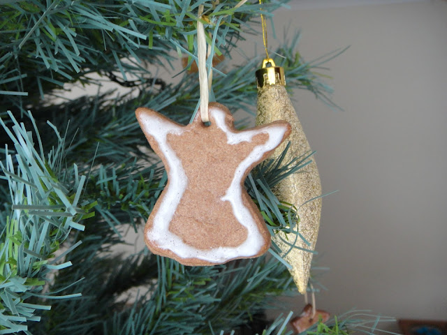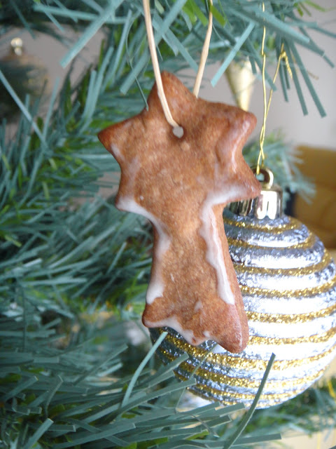 Depois com glacé enfeitam-se as bolachas e depois coloca-se a fita e penduram-se na árvore de natal.