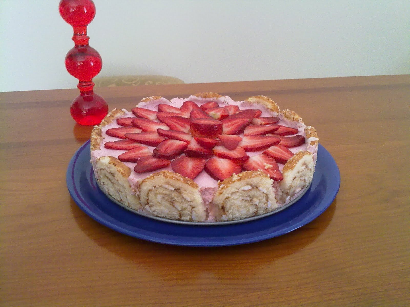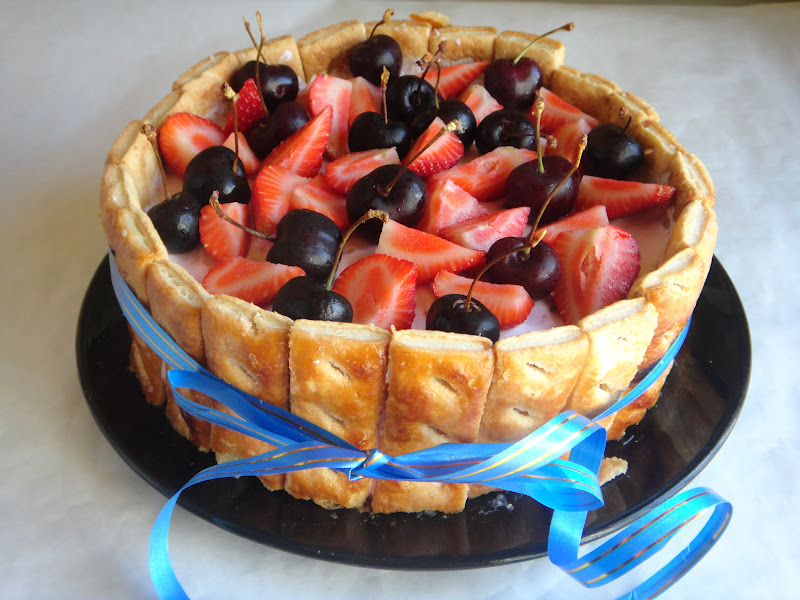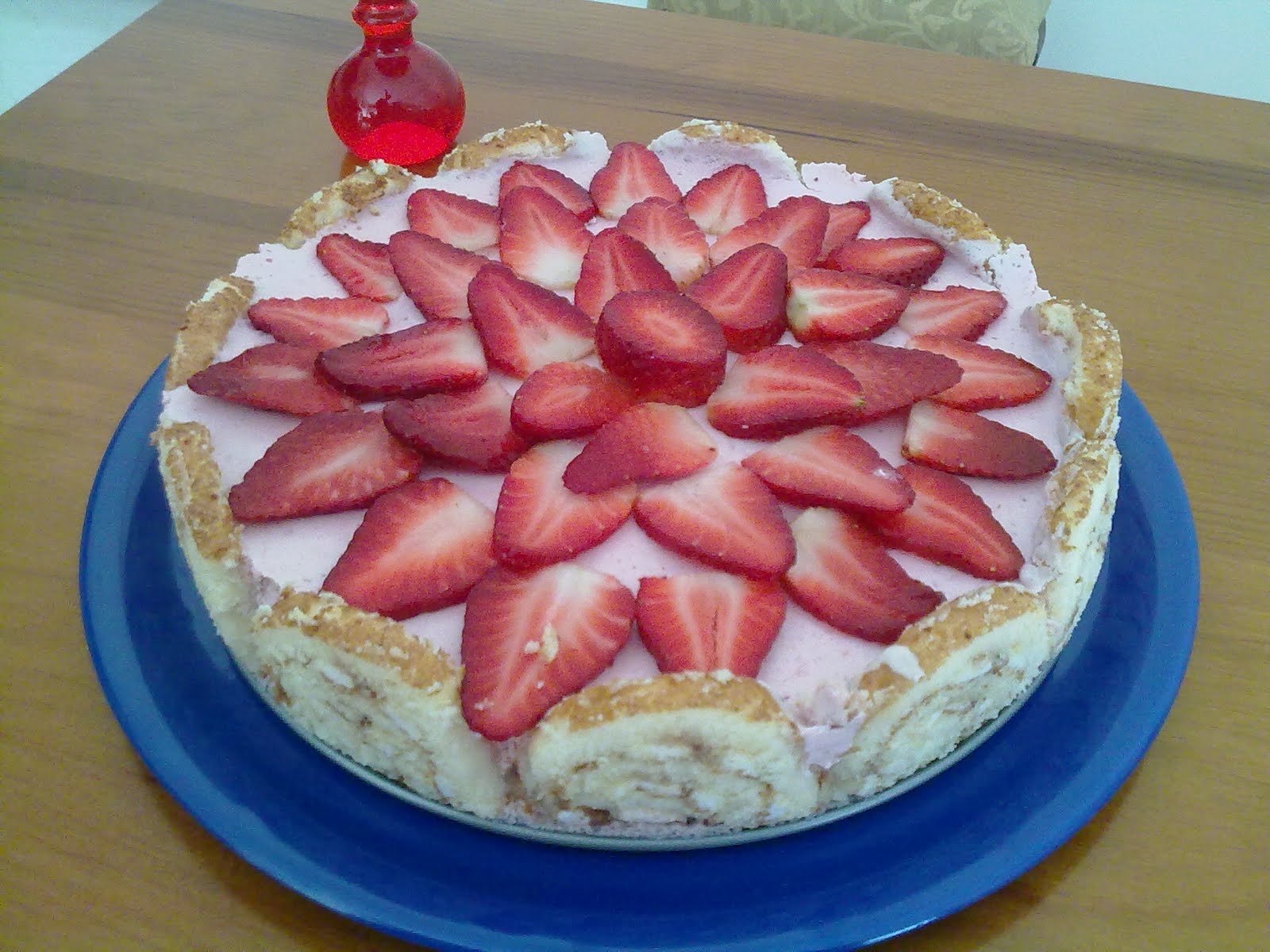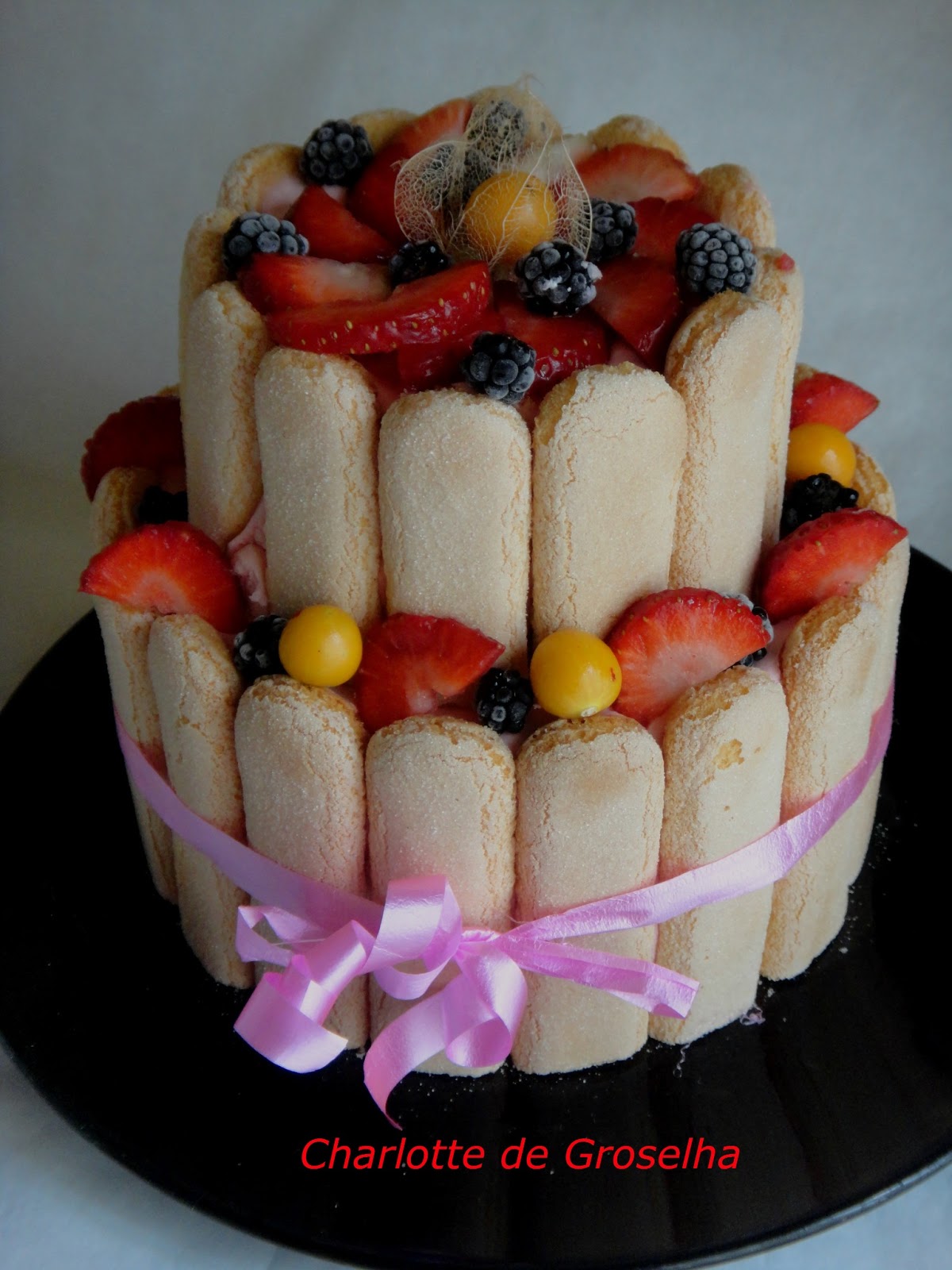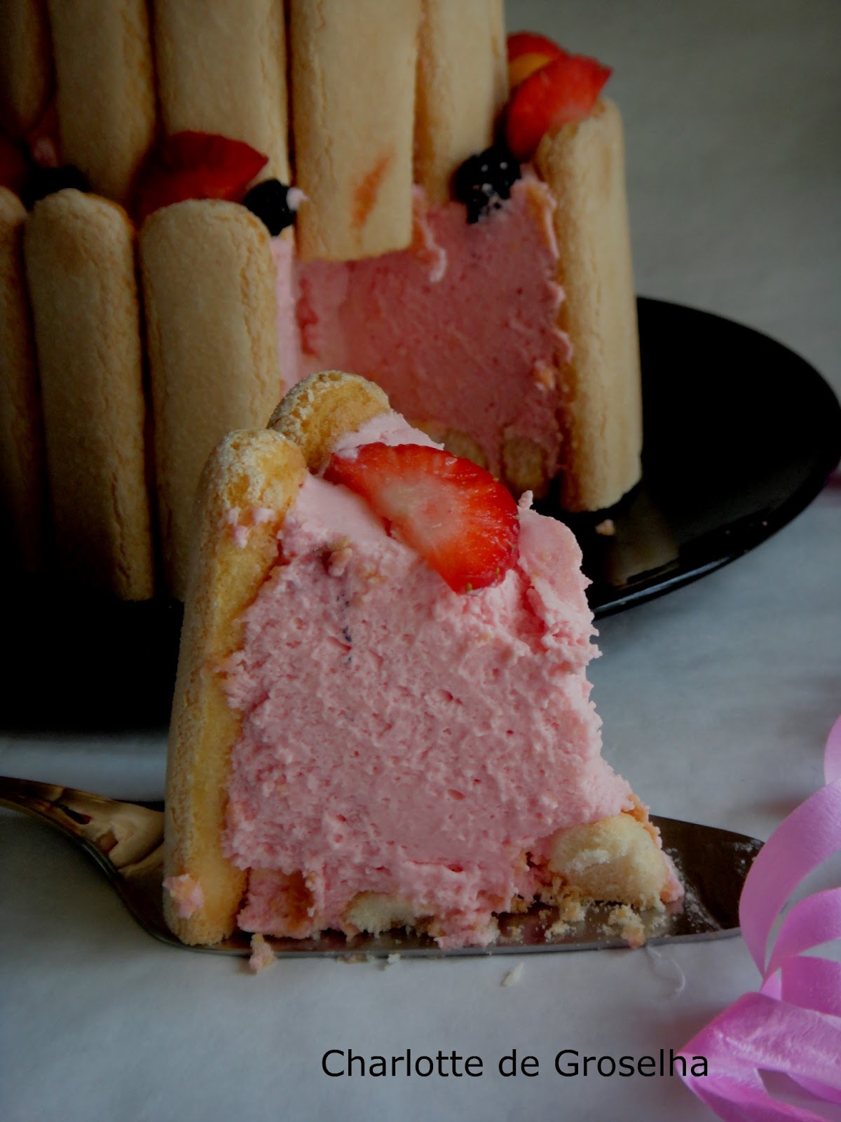 Na hora de servir, retira-se o aro , as folhas de acetato e decora-se com morangos ou outro fruto a gosto.